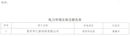 貴州省經(jīng)信委日前發(fā)布了《關(guān)于對列入政府準(zhǔn)入目錄的電力市場主體進(jìn)行公示的通知》,通知中稱,貴州華仁新材料有限公司符合年度電力市場化交易準(zhǔn)入條件,同意列入貴州電力市場主體準(zhǔn)入目錄。詳情如下: