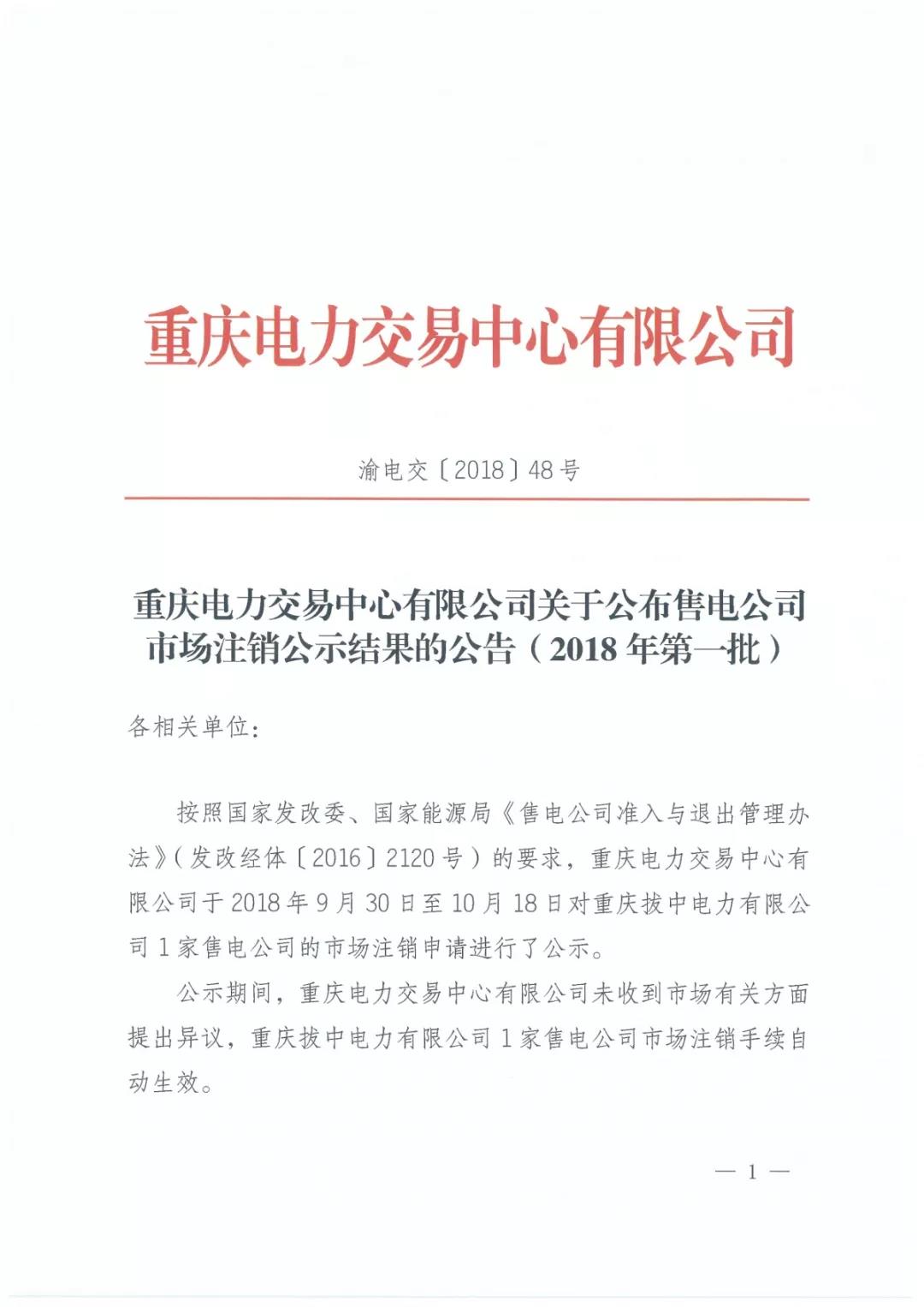 重慶關(guān)于公布售電公司市場注銷公示結(jié)果的公告(2018年第一批)