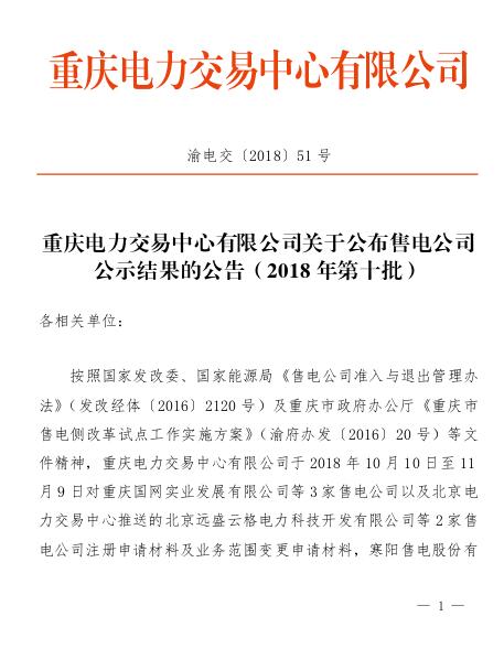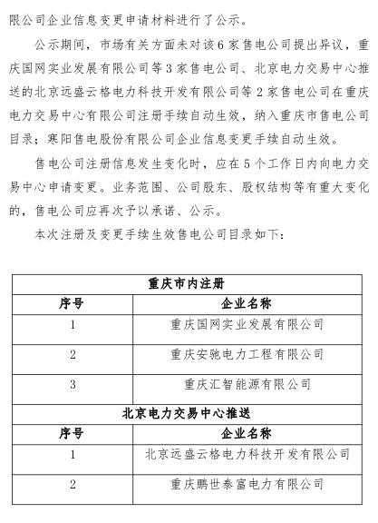 重慶新增5家售電公司(2家為北京推送) 另有1家售電公司注冊(cè)信息變更生效
