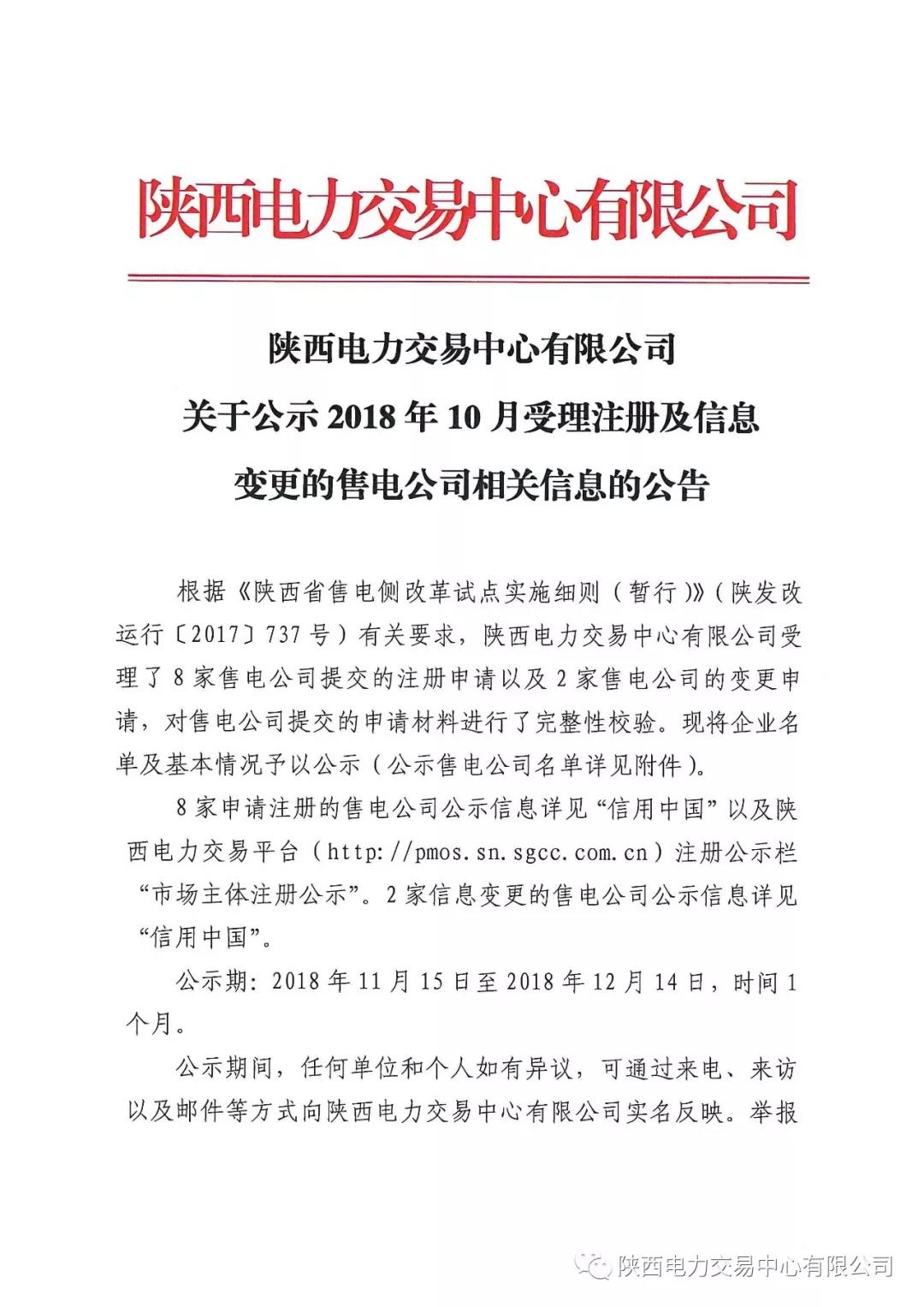 陜西電力交易中心有限公司關(guān)于公示2018年10月受理注冊及信息變更的售電公司相關(guān)信息的公告