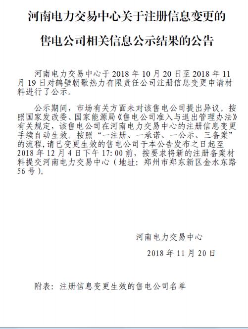河南電力交易中心日前發(fā)布了《關(guān)于注冊(cè)信息變更的售電公司相關(guān)信息公示結(jié)果的公告》,鶴壁朝歌熱力有限責(zé)任公司注冊(cè)信息變更手續(xù)自動(dòng)生效。
