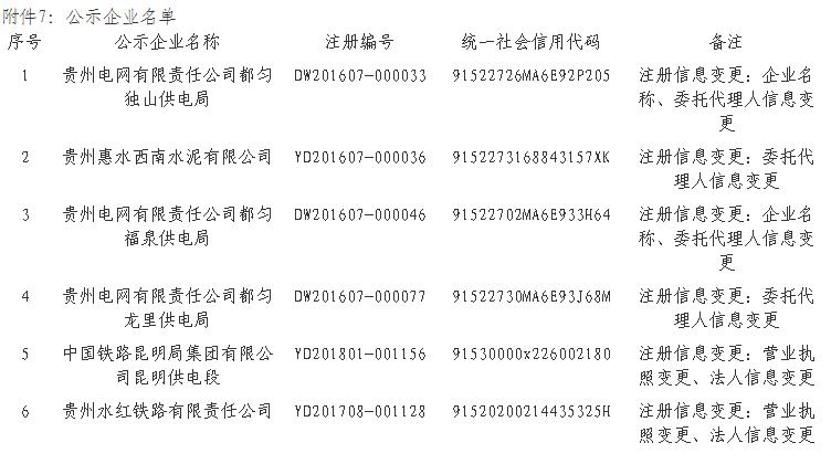 公示貴州電網(wǎng)有限責任公司都勻獨山供電局、貴州電網(wǎng)有限責任公司都勻龍里供電局2家售電公司及貴州惠水西南水泥有限公司、中國鐵路昆明局集團有限公司昆明供電段、貴州水紅鐵路有限責任公司3家電力用戶、貴州電網(wǎng)有限責任公司都勻福泉供電局1家電網(wǎng)企業(yè)共6家市場主體提出的注冊