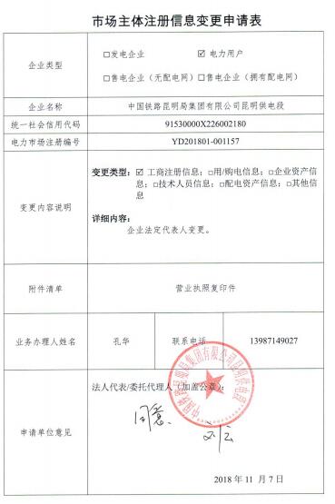 附件5:《市場主體注冊信息變更申請表(中國鐵路昆明局集團有限公司昆明供電段)》(另附)