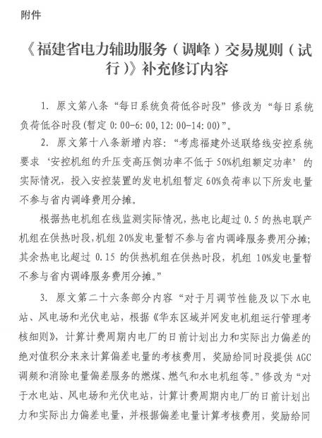 新增第二十八條“根據(jù)《華東電網(wǎng)調(diào)峰輔助服務(wù)市場運(yùn)營規(guī)則》,在福建省內(nèi)電力電量平衡后調(diào)峰資源如有盈缺,為保證電網(wǎng)安全運(yùn)行和福建清潔電源消納,可通過市場化方式在華東電網(wǎng)調(diào)峰輔助服務(wù)市場進(jìn)行交易。”等