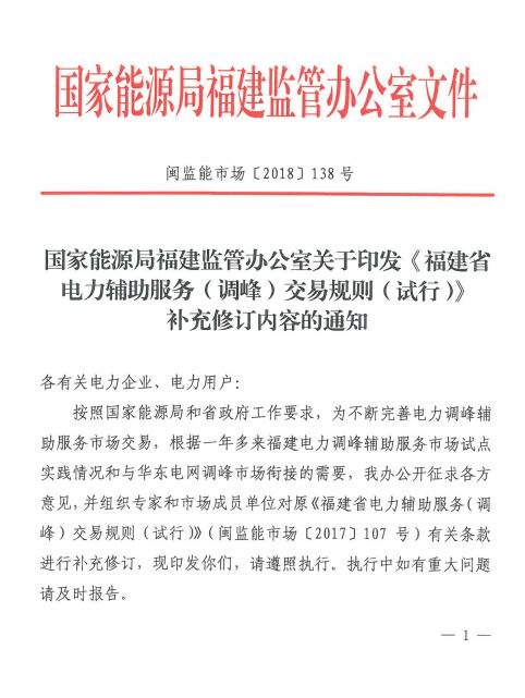 福建能監(jiān)辦發(fā)布了關(guān)于印發(fā)《福建省電力輔助服務(wù)(調(diào)峰)交易規(guī)則(試行)》