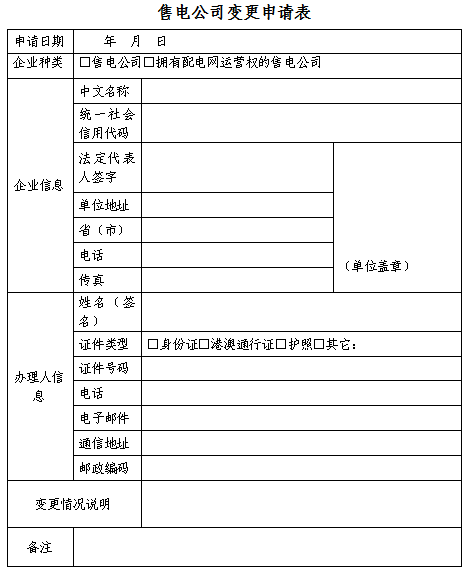 1、售電公司變更申請表;(見附件1)