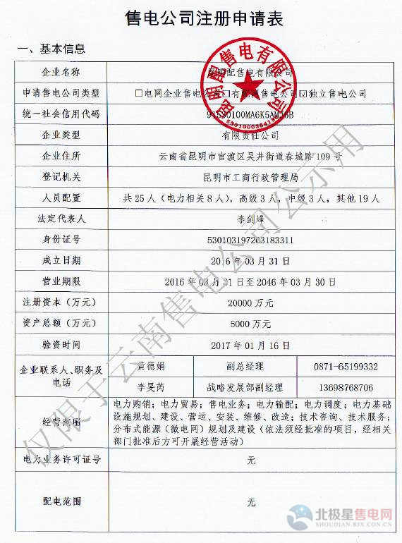 按照國家發(fā)展改革委、國家能源局《售電公司準入與退出管理辦法》(發(fā)改經體〔2016〕2120號)、《云南省售電側改革實施方案》(云電改辦〔2017〕1號)的要求,昆明電力交易中心受理了下列售電公司的注冊申請,對售