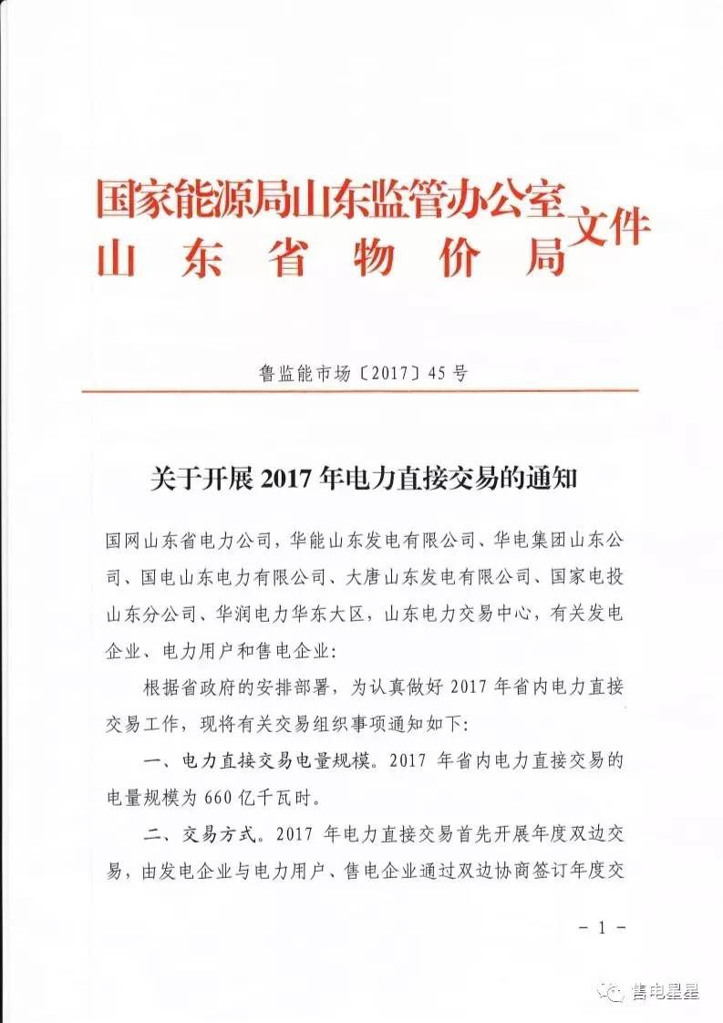 近日,國家能源局山東監(jiān)管辦公室、山東省物價局聯(lián)合發(fā)布了《關于開展2017年電力直接交易的通知》。通知顯示發(fā)電企業(yè)與電力用戶、售電企業(yè)可通過雙邊協(xié)商簽訂年度交易意向書,售電公司在山東正式入場可以參與直接交易了!提出2017年省內電力直接交易的電量規(guī)模為1000億(用戶側)年初暫安排省內交易660億千瓦時。售電企業(yè)在4月14日-17日向山東電力交易中心提交代理協(xié)議(或合同)。同時,《通知》表明企業(yè)自各機組參與直接交易的政策不變。