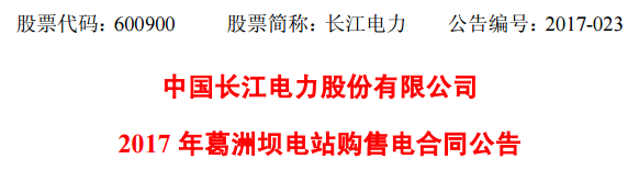 2017年5月31日,中國長江電力股份有限公司作為售電方,與購電方國家電網(wǎng)公司華中分部簽訂了《2017 年度葛洲壩電站購售電合同》。