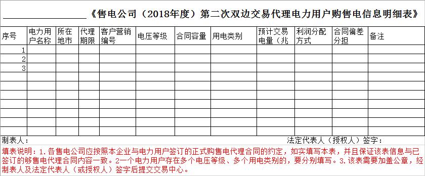 4.請(qǐng)各售電公司將2018年度第二次雙邊交易代理的全部用戶信息進(jìn)行匯總,填寫并提交《售電公司(2018年度)第二次雙邊交易代理電力用戶購售電信息明細(xì)表》(見附件三),并嚴(yán)格按照填報(bào)說明填寫。