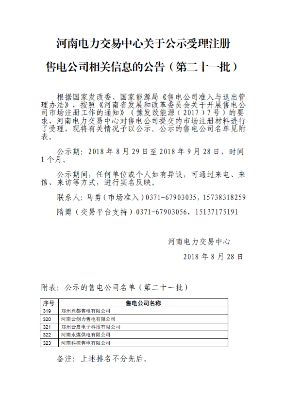 河南電力交易中心日前發(fā)布了《河南電力交易中心有限公司關(guān)于公示受理注冊售電公司相關(guān)信息的公告(第二十一批)》,鄭州興都售電有限公司等5家售電公司在河南電力交易中心有限公司對售電公司提交的市場注冊材料進(jìn)行了受理,現(xiàn)將有關(guān)情況子以公示。公示期:2018年8月29日至2018年9月28日