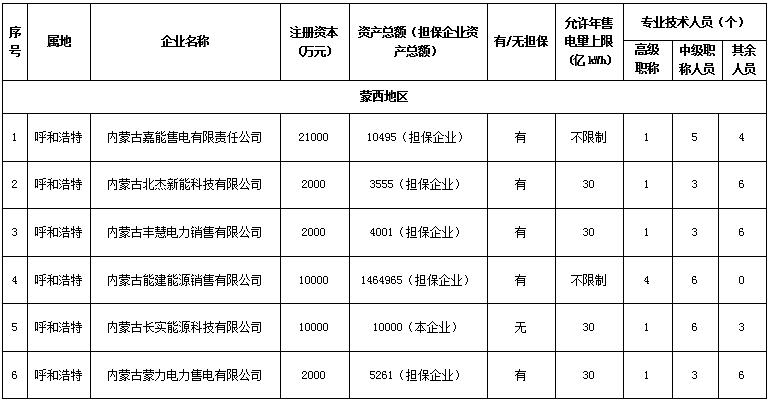 內(nèi)蒙古公示擬參與電力市場(chǎng)的19家售電公司和信息變更的1家售電公司