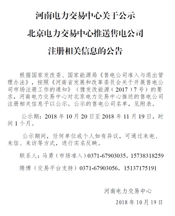 河南電力交易中心日前發(fā)布了《關(guān)于公示北京電力交易中心推送售電公司注冊相關(guān)信息的公告(2018年10月19日)》,公示北京推送的河南晟之威電力銷售有限公司1家售電公司,公示期為2018年10月20日至11月19日,時間一個月。