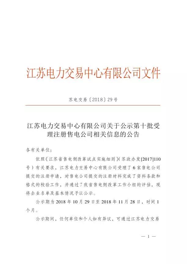 江蘇電力交易中心有限公司關于公示第十批受理注冊售電公司相關信息的公告