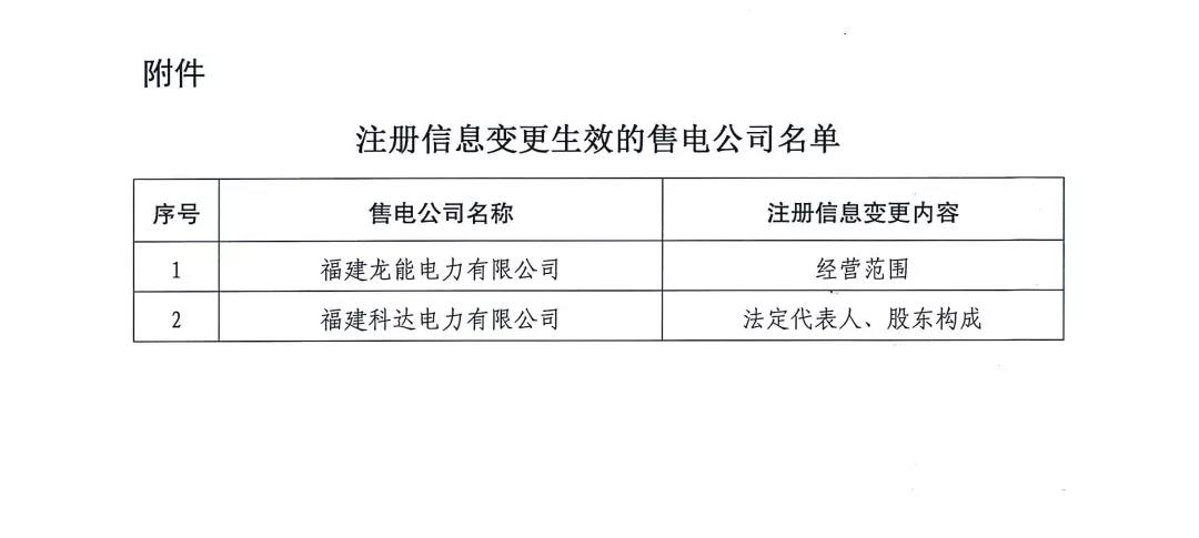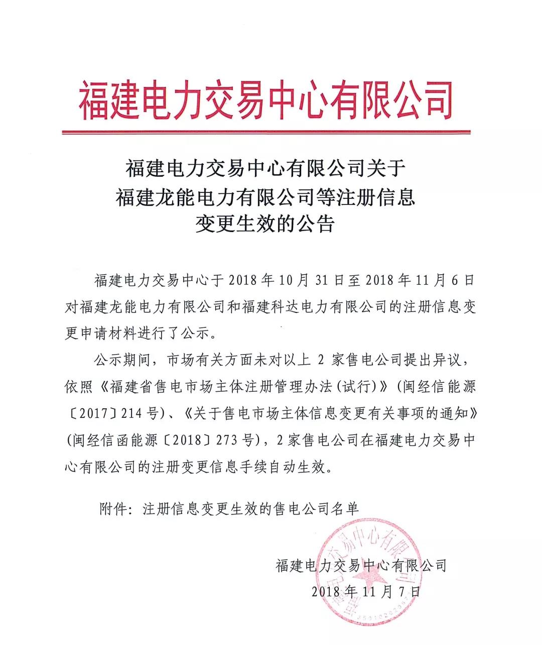 福建電力交易中心有限公司關(guān)于福建龍能電力有限公司等注冊信息變更生效的公告