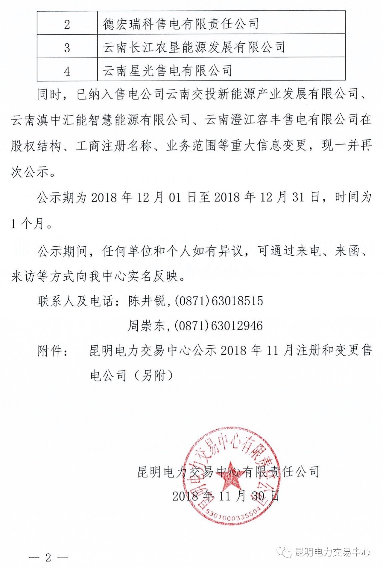 昆明電力交易中心日前發(fā)布了《關于公示2018年11月注冊售電公司的公告》,公示4家售電公司的注冊申請,公示期為2018年12月1日至12月31日,時間一個月。