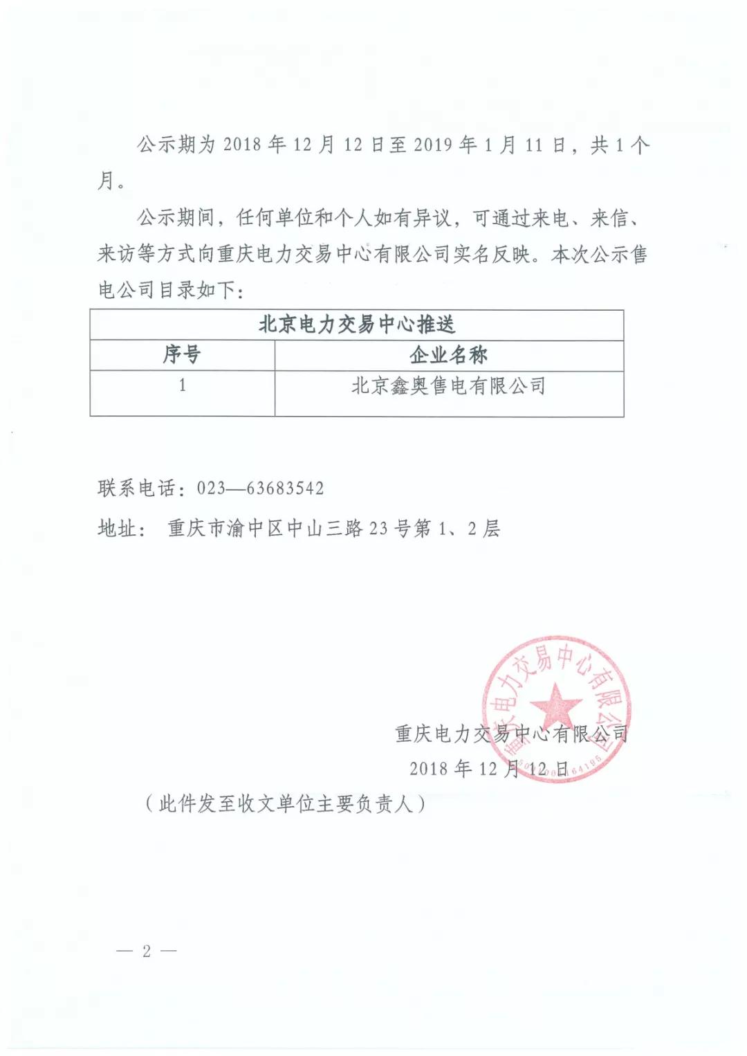 重慶電力交易中心日前發(fā)布了《關(guān)于公示受理注冊的售電公司有關(guān)信息的公告》,公示北京推送的北京鑫奧售電有限公司1家售電公司業(yè)務(wù)范圍變更申請,公示期為2018年12月12日至2019年1月11日,共1個月。