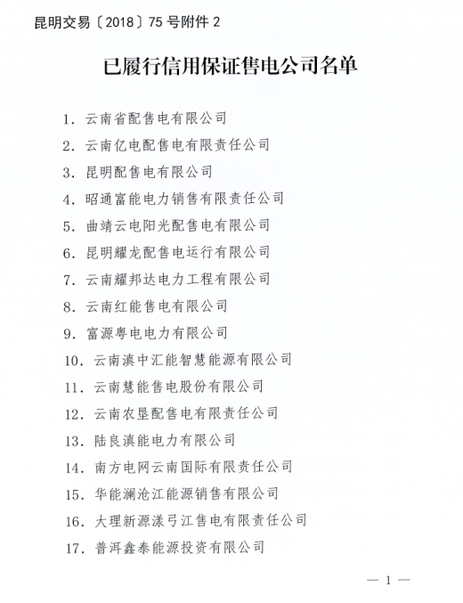 云南2018年5月售電企業(yè)及已履行信用保證售電公司名單