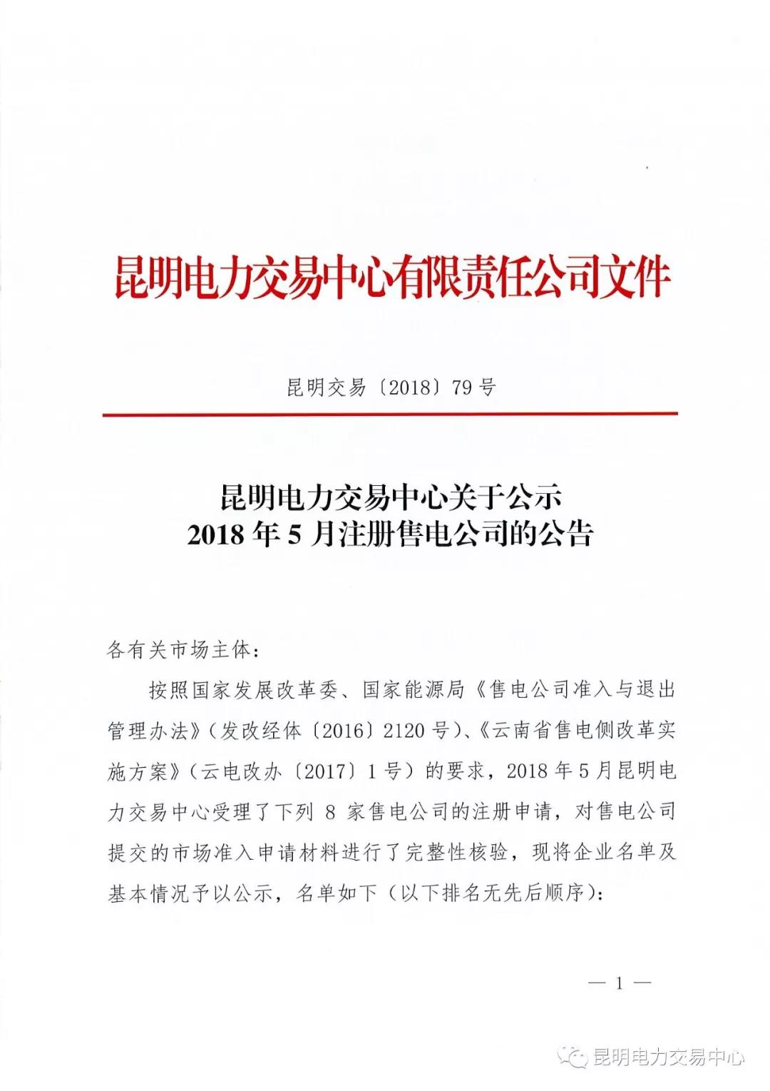 昆明電力交易中心關(guān)于公示2018年5月注冊售電公司的公告