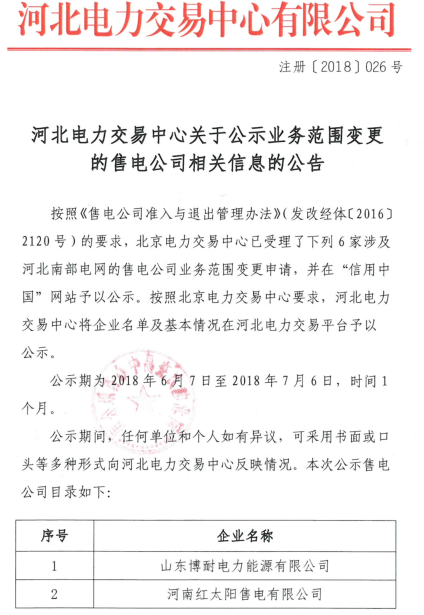 按照《售電公司準(zhǔn)入與退出管理辦法》的要求,北京電力交易中心已受理了下列6家涉及河北南部電網(wǎng)的售電公司業(yè)務(wù)范圍變更申請(qǐng)。公示期為2018