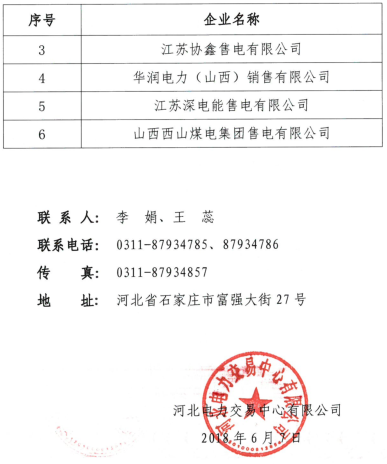 按照《售電公司準(zhǔn)入與退出管理辦法》的要求,北京電力交易中心已受理了下列6家涉及河北南部電網(wǎng)的售電公司業(yè)務(wù)范圍變更申請(qǐng)。公示期為2018年6月7日至2018年7月6日,時(shí)間1個(gè)月。