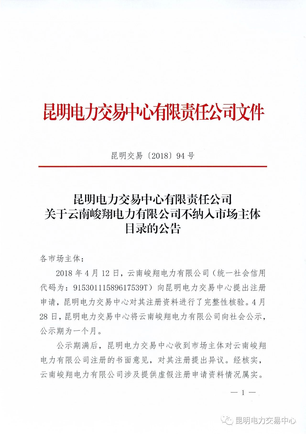 昆明電力交易中心日前發(fā)布了《昆明電力交易中心有限責(zé)任公司關(guān)于云南峻翔電力有限公司不納入市場主體目錄的公告》,經(jīng)核實(shí)云南峻翔電力有限