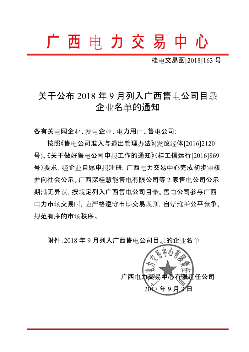 廣西2018年9月列入售電公司目錄企業(yè)名單