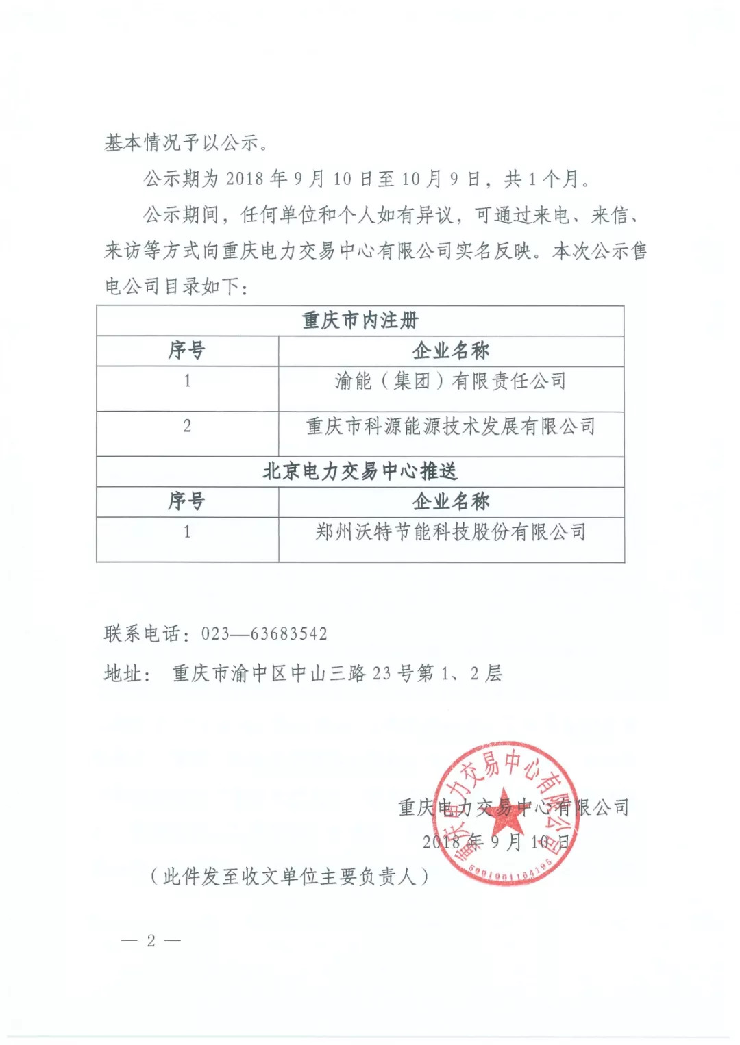 重慶電力交易中心日前發(fā)布了《重慶電力交易中心有限公司關(guān)于公示受理注冊(cè)的售電公司有關(guān)信息的公告(2018年第九批)》,受理了渝能(集團(tuán))有限責(zé)任公司等2家售電公司注冊(cè)申請(qǐng)、北京電力交易中心推送的鄭州沃特節(jié)能科技股份有限公司1家售電公司業(yè)務(wù)范圍變更申請(qǐng),并對(duì)提交的市場(chǎng)準(zhǔn)入申請(qǐng)材料進(jìn)行了完整性核驗(yàn),現(xiàn)將企業(yè)名單及基本情況予以公示。公示期為2018年9月10日至10月9日,共1個(gè)月。詳情如下: