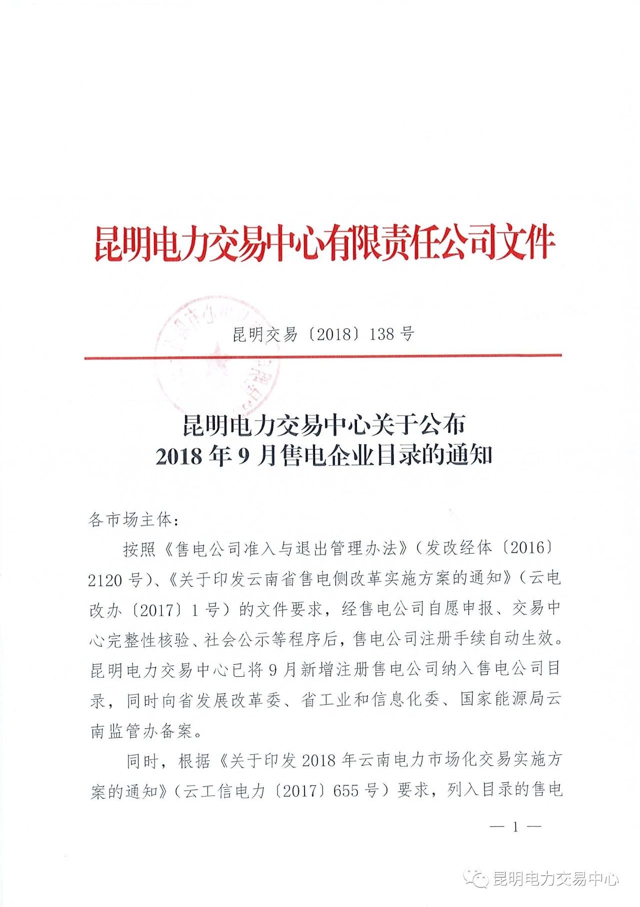 昆明電力交易中心日前發(fā)布了《昆明電力交易中心關(guān)于公布2018年9月售電企業(yè)目錄的通知》,按照《售電公司準(zhǔn)入與退出管理辦法》(發(fā)改經(jīng)體(2016)2120號)、《關(guān)于印發(fā)云南省售電側(cè)改革實(shí)施方案的通知》(云電改辦(2017)1號)的文件要求,經(jīng)售電公司自愿申報(bào)、交易中心完整性核驗(yàn)、社會(huì)公示等程序后,售電公司注冊手續(xù)自動(dòng)生效。已將9月新增注冊售電公司納入售電公司目錄,詳見附件1。