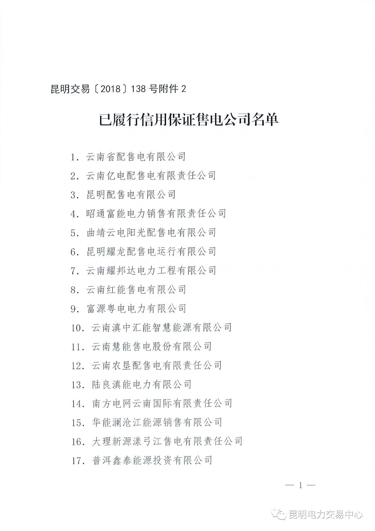 根據(jù)《關(guān)于印發(fā)208年云南電力市場化交易實(shí)施方案的通知》(云工信電力(2017)655號)要求,列入目錄的售電公司履行信用保證后可具備入場交易條件。已履行信用保證售電公司名單,詳見附件2。詳情如下:
