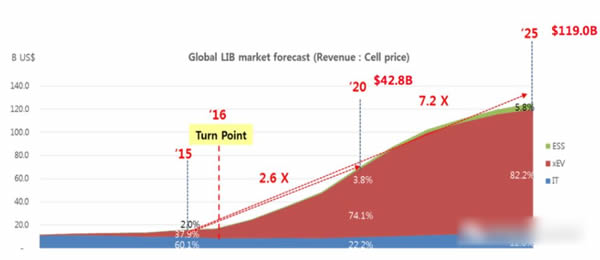 綜觀鋰離子電池的發(fā)展,動(dòng)力電池正在逐漸成為鋰離子電池產(chǎn)業(yè)的絕對(duì)主力,2016年是鋰離子電池產(chǎn)業(yè)的分水嶺,在2016年以前,IT產(chǎn)品是鋰離子電池的主力軍,在這之后,動(dòng)力電池的需求將持續(xù)快速增長(zhǎng),根據(jù)韓國(guó)SNE research的預(yù)測(cè),全球動(dòng)力電池產(chǎn)值在2020年將達(dá)到317億美元,在2025年將達(dá)到979億美元,作為一個(gè)千億美元級(jí)的巨大市場(chǎng),必將吸引眾多的玩家參與其中,技術(shù)競(jìng)爭(zhēng)和資本競(jìng)爭(zhēng)必將持續(xù)加劇,動(dòng)力電池市場(chǎng)將會(huì)從藍(lán)海轉(zhuǎn)變?yōu)橐黄t海。