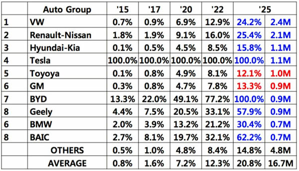 在電動(dòng)汽車(chē)產(chǎn)業(yè)快速發(fā)展的同時(shí),整個(gè)行業(yè)的競(jìng)爭(zhēng)也會(huì)日漸加劇,呈現(xiàn)出“強(qiáng)者愈強(qiáng),弱者去死”的格局。根據(jù)SNEresearch的預(yù)測(cè),未來(lái)全球前十大電動(dòng)汽車(chē)廠商將占據(jù)全部電動(dòng)汽車(chē)市場(chǎng)71-77%的市場(chǎng)份額,根據(jù)預(yù)測(cè)大眾和日產(chǎn)在2025年將會(huì)賣(mài)出超過(guò)200萬(wàn)臺(tái)電動(dòng)汽車(chē),成為電動(dòng)汽車(chē)產(chǎn)業(yè)最大的贏家,慶幸的是我們?cè)谇笆箅妱?dòng)汽車(chē)廠商看到了三家中國(guó)廠商——BYD、吉利和北汽。