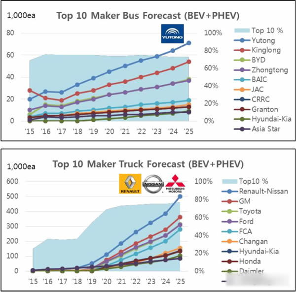在電動(dòng)大巴車(chē)方面中國(guó)廠家具有絕對(duì)優(yōu)勢(shì),在排名前十的電動(dòng)大巴車(chē)廠商中,中國(guó)廠家占據(jù)了9席(宇通、金龍、比亞迪、中通、北汽江淮、中國(guó)中車(chē)、廣通和亞星),并且這一優(yōu)勢(shì)還將持續(xù)擴(kuò)大,在2025年排名前三的宇通、金龍和BYD在市場(chǎng)份額上將占據(jù)絕對(duì)優(yōu)勢(shì)。在電動(dòng)卡車(chē)方面,則是日產(chǎn)、通用和豐田的天下,國(guó)內(nèi)僅有長(zhǎng)安和東風(fēng)兩家上榜,而且這一差距還在持續(xù)還將持續(xù)擴(kuò)大,長(zhǎng)安、東風(fēng)以及廣大的國(guó)內(nèi)廠商還需要繼續(xù)努力,奮力追趕,爭(zhēng)取縮小與日產(chǎn)、通用等汽車(chē)廠商的差距。