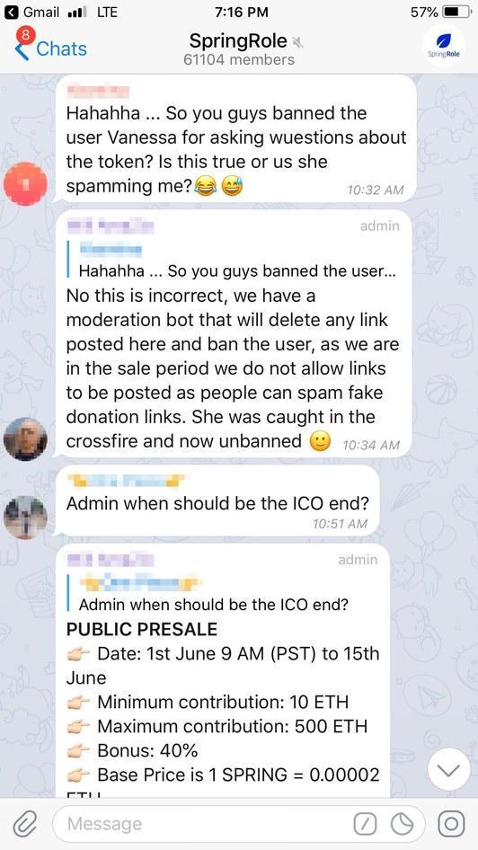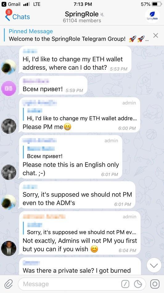 一旦一個(gè)項(xiàng)目在Telegram中積攢了一定的關(guān)注度,就開(kāi)始控制數(shù)量了。任何活躍的Telegram群組都會(huì)與推廣其他項(xiàng)目的垃圾郵件發(fā)送者、向該群組添加虛假用戶(hù)的僵尸工具以及試圖欺騙人們購(gòu)買(mǎi)虛假通證的模仿者進(jìn)行抗?fàn)?。(Mandaville說(shuō)他發(fā)現(xiàn)了7個(gè)假的SpringRole Telegram群組和10個(gè)使用他的名字和照片的不同賬戶(hù)。)此外,競(jìng)爭(zhēng)對(duì)手還會(huì)迫切傳播有關(guān)該項(xiàng)目的FUD(恐懼、不確定性和懷疑)。“就像進(jìn)行一場(chǎng)有5萬(wàn)人的Twitter直播一樣,其中有支持也有反對(duì)你產(chǎn)品的人,”Jones說(shuō)。