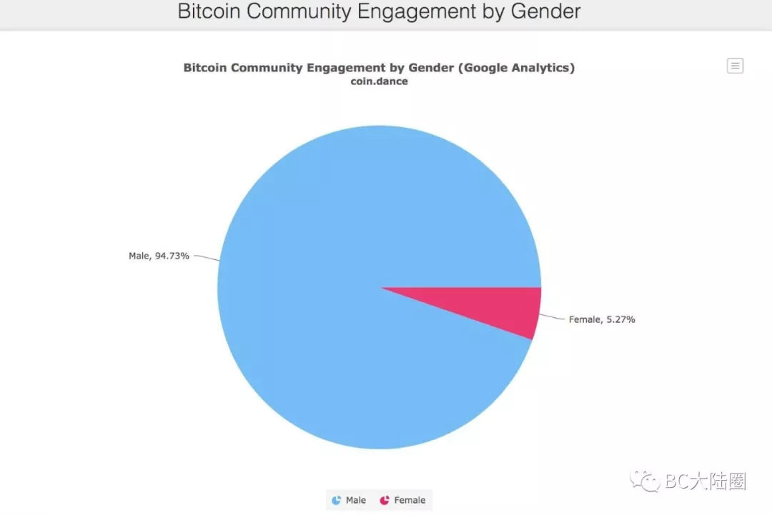 據(jù)統(tǒng)計網(wǎng)站Coin.Dance的一組數(shù)據(jù)表明,截止到2018年5月,在比特幣社區(qū)參與和積極參與的人數(shù)中,有94.73%來自男性,5.27%來自女性。在此之前,2017年10月進(jìn)行的一項(xiàng)調(diào)查發(fā)現(xiàn),96%的以太坊用戶都是男性,84%的以太坊錢包持有者都是男性。在財富增加值方面,2017年,比特幣投資者的財富增加了850億美元,其中女性財富占比大約只有5.88%,也就是50億美元。數(shù)據(jù)說明,加密貨幣是一個以男性為主導(dǎo)的行業(yè)。