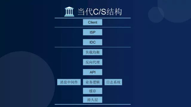 現(xiàn)在回到傳統(tǒng)的客戶端和服務(wù)器系統(tǒng)上面,我們來看看這邊是怎么回事,最上面是客戶端,下面先走到你的通訊服務(wù)商ISP,通訊服務(wù)商先找IDC,做緩存的服務(wù)器,如果沒有的話,先通過負(fù)載均衡和反向代理,然后再分到API,然后通過業(yè)務(wù)邏輯,然后內(nèi)部互相發(fā)消息,log存到日志系統(tǒng)里面。那么從上到下的大部分東西是干什么的?就是緩存??蛻舯緳C(jī)有一個(gè)緩存,ISP給你緩存,IDC就是緩存公司,反向代理有緩存,下面的持久層也有緩存。你再訪問的時(shí)候,你就可以直接訪問,不會(huì)再去深入到真正的服務(wù)器讀數(shù)據(jù)庫。