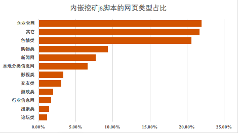 實際上,網頁挖礦已經曾被曝光多次,但內嵌挖礦代碼的網頁并沒有明顯減少的趨勢,反而是相對穩(wěn)定,甚至是波動性的增長。這也就表明,大量網站存在著并未自查或者并未采取防范措施的可能。網站所嵌入的挖礦代碼在一定情況下已經不再是被動感染的了。利用在網站中插入挖礦腳本來實現(xiàn)流量變現(xiàn)正在成為一股不可阻擋的勢力,這顯然比網站的展示廣告等方式有著更加直接可觀的收益。挖礦的巨大利潤勢必會讓許多站長效仿,黑客們也必然會趨之若鶩。網頁方面可能存在的不作為和效仿牟利,使得挖礦病毒更加猖獗,廣大網民更需在瀏覽網頁時提高警惕。根據金山毒霸AI云盾系統(tǒng)監(jiān)測顯示,企業(yè)官網、色情類和購物類等停留相對時間較長的網站成為了內嵌挖礦代碼的重災區(qū)。