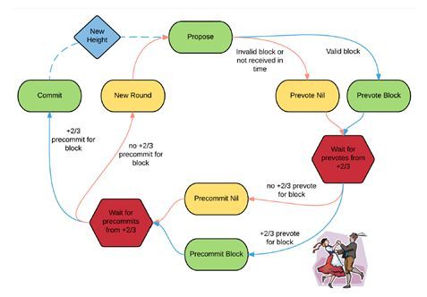 Tendermint的整個共識過程看起來其實比較簡單,除了上述的這個過程外,還有兩點需要注意。第一,圖1中右下角有兩個小人正在跳舞,而這種舞叫做“Polka”,來自捷克。第一輪預(yù)投票的過程也被稱作“Polka”。這個詞在Tendermint中最開始在Buchman的博士論文中出現(xiàn),原因是在預(yù)投票的過程中,驗證人的工作與Polka十分相似[ “The term evolved to polka as it was realized the validators are doing the polka.”引自論文。至于叫這個名字的更細(xì)節(jié)原因,筆者在查閱資料過程中并沒有發(fā)現(xiàn),有興趣的讀者可以自行查找]。