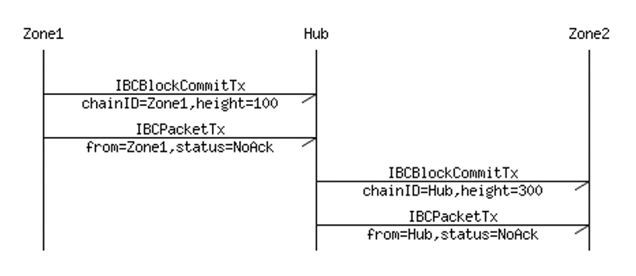 為了說明IBC的工作原理,我們假設(shè)現(xiàn)在有三個空間,分別是空間1、Cosmos中心以及空間2?,F(xiàn)在空間1中有一個用戶想要發(fā)送一筆代幣給空間2的另一個用戶,那么空間1的這個發(fā)送人需要提供兩個證明:IBCBlockCommitTx和IBCPacketTx。IBCBlockCommitTx通過哈希值來表明發(fā)送方所在區(qū)塊鏈網(wǎng)絡(luò)的最新的區(qū)塊是哪一塊。IBCPacketTx則是轉(zhuǎn)賬本身的信息,包括發(fā)送方的身份證明等內(nèi)容。這兩個證明以交易請求的方式首先從空間1發(fā)起,在空間1得到認(rèn)可之后,被Cosmos中心所接收,Cosmos中心隨后更新在中心的區(qū)塊鏈上的空間1的狀態(tài)(扣除轉(zhuǎn)賬消息中的代幣數(shù))。然后Cosmos中心也同樣發(fā)起這兩個交易,更新中心區(qū)塊鏈上的空間2的狀態(tài)(增加轉(zhuǎn)賬消息中的代幣數(shù)),將代幣發(fā)送到空間2中。而在Cosmos中心發(fā)起的兩個交易證明與先前發(fā)起的不同地方在于,此時IBCBlockCommitTx證明的是Cosmos中心的最新區(qū)塊,而不是空間1。而IBCPacketTx則與先前的一致。這個過程可以通過圖4來表示。