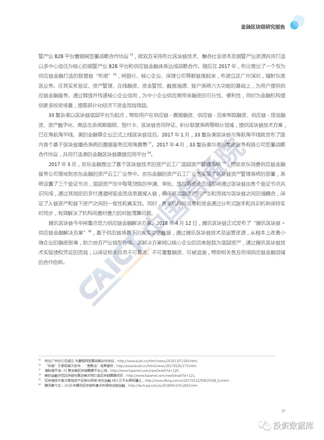 2018年7月,中國信通院產(chǎn)業(yè)與規(guī)劃研究所大數(shù)據(jù)與數(shù)字經(jīng)濟(jì)研究部與騰訊研究院聯(lián)合對金融區(qū)塊鏈細(xì)分領(lǐng)域開展了研究,并發(fā)布了《金融區(qū)塊鏈研究報(bào)告(2018)》。