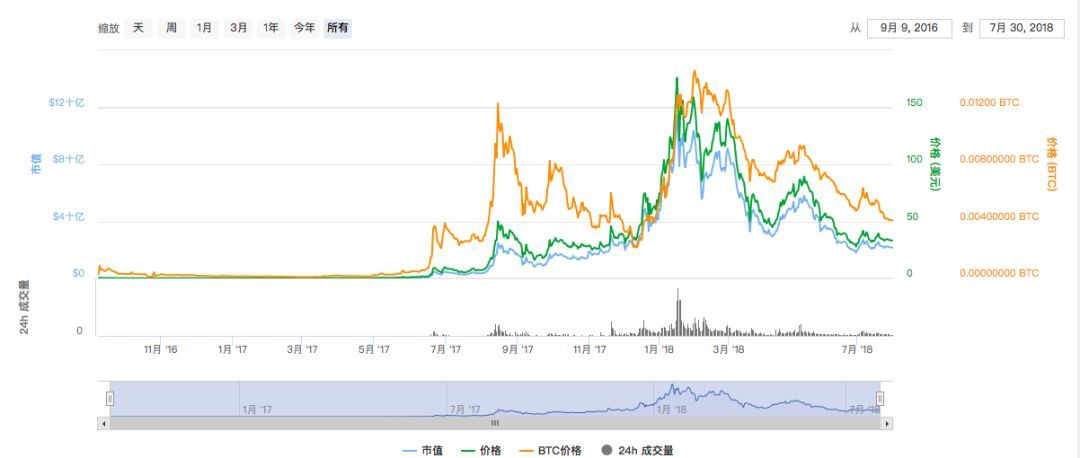 “94”是幣圈分水嶺,有些項(xiàng)目偃旗息鼓,也有的項(xiàng)目挺過來并迎來大牛市。在這個(gè)時(shí)間點(diǎn),量子鏈價(jià)格也一度從最高點(diǎn)的18美金,下跌至10美金左右,幾近腰斬。2017年年底,隨著牛市到來,量子鏈價(jià)格瘋狂上漲,2018年1月,量子鏈價(jià)格上漲到歷史最高價(jià)86美金。然而,隨著2018年連續(xù)大半年的熊市,量子鏈價(jià)格一路陰跌至8美金左右。