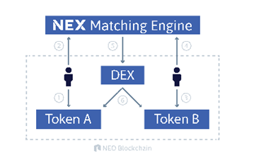 NEX匹配引擎與提交用戶之間交易的智能合約進(jìn)行通信。這個智能合約遵循由NEP-5通證標(biāo)準(zhǔn)驅(qū)動的邏輯,NEP-5標(biāo)準(zhǔn)允許合約持有涉及活動狀態(tài)交易掛單的用戶的代幣。匹配引擎開始計算匹配后,會發(fā)送智能合約涉及的所有用戶地址以及在他們之間交易的代幣的類型和數(shù)量來完成交易。