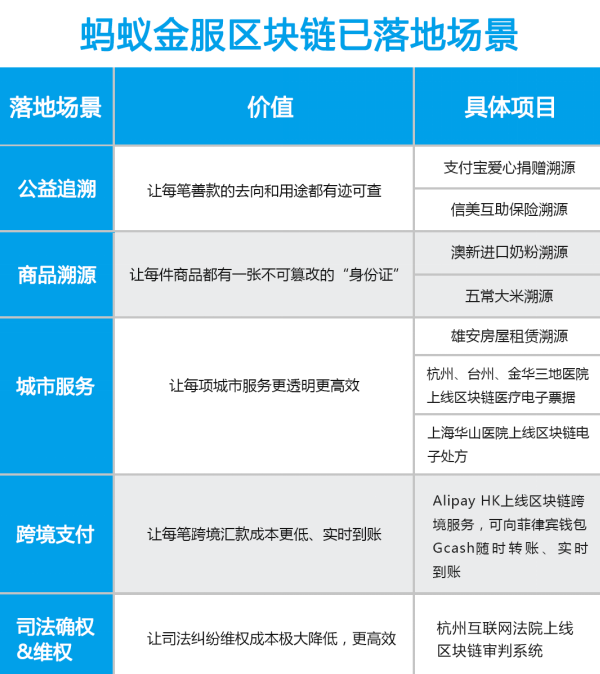 據(jù)了解,螞蟻金服區(qū)塊鏈技術(shù)目前在全球擁有最多的區(qū)塊鏈申請(qǐng)技術(shù)專(zhuān)利,并且在業(yè)內(nèi)率先加速推進(jìn)區(qū)塊鏈規(guī)?;涞亍D壳?,螞蟻金服區(qū)塊鏈已經(jīng)在公益溯源、商品正品溯源、跨境支付、房屋租賃溯源、電子票據(jù)溯源、供應(yīng)鏈金融、數(shù)字版權(quán)等領(lǐng)域?qū)崿F(xiàn)落地。