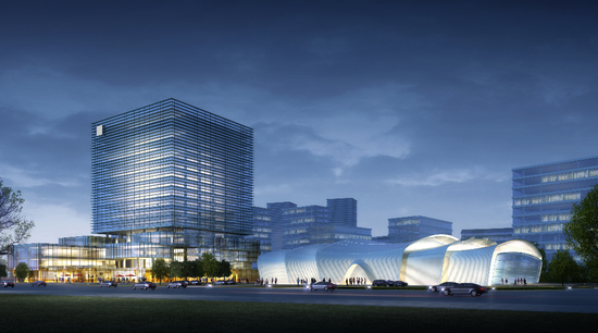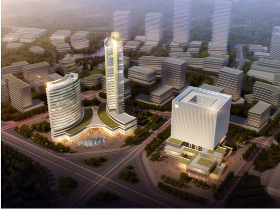 智慧谷項目建筑物上,以荔波大小七孔橋為參考,打造現(xiàn)代的建筑群落,體現(xiàn)了中國傳統(tǒng)文化中“天圓地方”的寓意。高速路入口處的主體酒店和辦公樓區(qū),以弧形狀的有機(jī)形態(tài)來展示自然和科技的奧妙,以矩形方體元素衍生出的簡約而豐富的體量和空間組合很好的闡述了這一寓意。