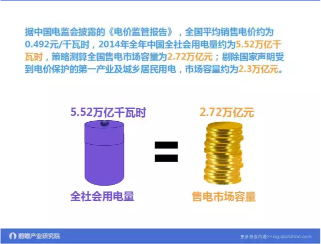 據(jù)媒體報道,電力體制改革6個配套文件即將出臺,售電側(cè)改革試點(diǎn)進(jìn)入倒計時。新電改會帶來很多巨大商機(jī),比如售電制改革,鼓勵社會資本市場進(jìn)入,包括配電領(lǐng)域混合所有制改革。所以從售電公司角度看,更多的關(guān)注電