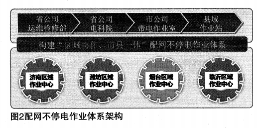 1.遵循上下貫通、橫向協同、指揮順暢、運作高效的原則,建立適應山東公司的。“區(qū)域協作,市縣一體”的配網不停電作業(yè)體系架構:以省公司運維檢修部為專業(yè)歸口管理部門,省電科院為技術支撐單位,依托4個區(qū)域作業(yè)中心,分片區(qū)開展需旁路作業(yè)裝備配合的lOkV復雜不停電項目協同作業(yè);市公司帶電作業(yè)室負責集約調配所轄縣域帶電作業(yè)站專業(yè)資源,統一開展所轄區(qū)域配網不停電作業(yè)。