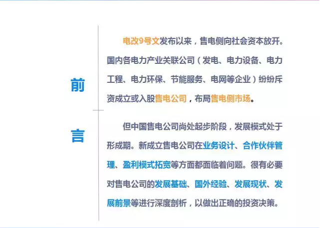據(jù)媒體報道,電力體制改革6個配套文件即將出臺,售電側(cè)改革試點進入倒計時。新電改會帶來很多巨大商機,比如售電制改革,鼓勵社會資本市場進入,包括配電領域混合所有制改革。所以從售電公司角度看,更多的關注電
