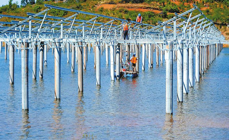 西昌市西溪鄉(xiāng)興國寺水庫,建設(shè)中的“漁光一體”光伏電站。該項(xiàng)目是我省首個(gè)智能魚塘光伏電站。建成后將實(shí)現(xiàn)水上清潔發(fā)電、水下現(xiàn)代化養(yǎng)殖、有機(jī)種植、生態(tài)農(nóng)業(yè)觀光旅游的循環(huán)經(jīng)濟(jì)模式。