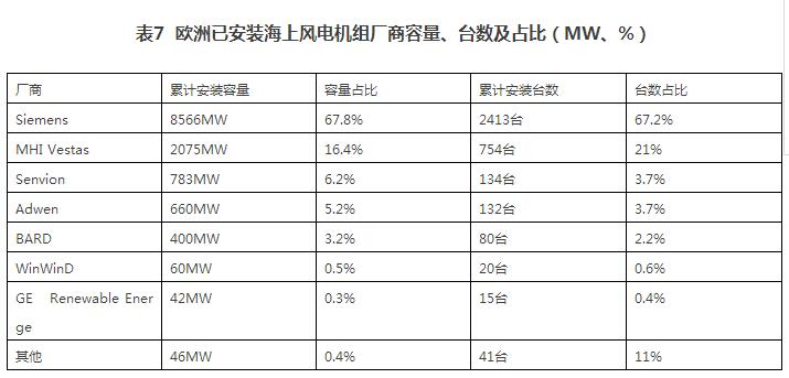 在2016年歐洲新增并網(wǎng)的1567MW(退役9MW,凈增1558MW)海上風(fēng)電裝機(jī)中,從整機(jī)制造商新增容量比例來(lái)看,西門(mén)子機(jī)組占到了96.4%,三菱-維斯塔斯占到了3.6%。并網(wǎng)機(jī)組的容量范圍在3-8MW。