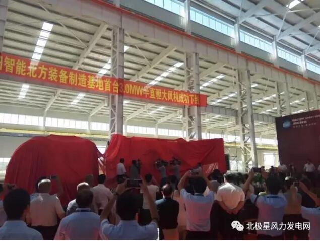 明陽(yáng)北方裝備制造基地首臺(tái)3.0MW半直驅(qū)風(fēng)電機(jī)組下線儀式現(xiàn)場(chǎng)